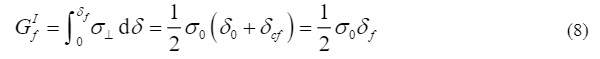 Whereas the crack initiation is based on Mode I fracture only; the post-cracked behaviour includes Mode II as well as Mode I. During damage accumulation, the shear modulus, G∥, is reduced in function of the crack opening width. At a crack opening displacement δcs, G∥ is reduced to zero. Moreover, a relative nodal displacement δu at ultimate failure of the element is to be defined, at which the element is removed from the simulation. This may either beat the point where the stiffness across the Mode I crack is reduced to zero, i.e. δf, or after in order to delay the element removal. When a crack initiates, the elastic strain energy accumulated in the element up to that point is constituting part of the total fracture energy. Hence, the fracture energy equals the area under the triangular curve in Fig. 3, which can be expressed as:
