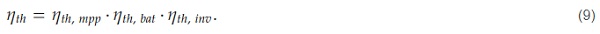 The theoretical system efficiency 𝜂𝑡ℎ can be calculated from the data sheet efficiencies of the MPP-tracker 𝜂𝑡ℎ,𝑚𝑝𝑝, battery 𝜂𝑡ℎ,𝑏𝑎𝑡, and inverter 𝜂𝑡ℎ,𝑖𝑛𝑣 (Equation (9)):