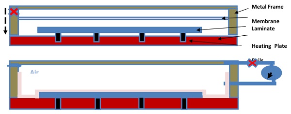 When the evacuation is finished, the membrane presses the module/laminate down onto the heating plate (sealing the laminate edges to prevent air to enter the laminate sandwich again.)