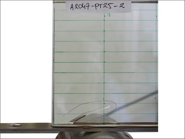 When applying structural adhesives with high shear stiffness and shear strength, fracture in glass may occur at the release of the pre-load in the set-up, or with some delay. Once the shear stress at the beam end reaches the level of glass resistance in shear (< adhesive shear strength), a crack is initiated at the lower glass edge, which results in a drop in shear stress towards the beam end.