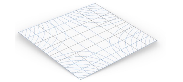 Since cold-warping planar glass into a hyperbolic paraboloid results in loss of transverse stiffness, curiosity led to ask what would happen if a shape that was initially a hyperbolic paraboloid was cold-warped by forcing perimeter supports to a planar shape (Figure 2). The hypothesis was that the entire sheet would become planar, and transverse stiffness would increase.
