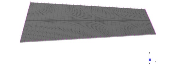 Pre-stressing was introduced into the model by imposing Z direction displacement at the perimeter nodes in the opposite value of the initial Z coordinate in a series of five deformation load steps. After perimeter nodes were enforced to Z=0mm, the entire surface became planar in the model. A pattern of pre-stress resulted, shown by the principal 11 tensile stress at mid depth of each plate element in Figure 4.