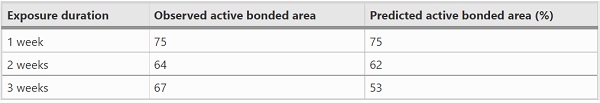 - It was shown that the numerically predicted active bond area was generally smaller than the one observed experimentally, especially for longer exposure periods. This indicates that a few areas of the joint might develop stress whitening, but still have some reduced capacity in terms of resisting crack propagation. Therefore, the change of the material properties is assumed to take place gradually and not abruptly as modelled with the current step function.