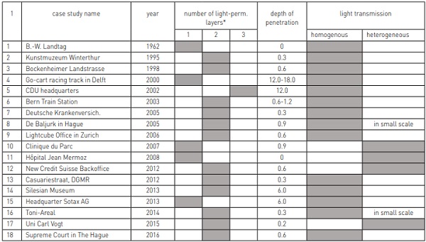 By visiting and photographing the case-study buildings the author could formulate opinions based on his personal impressions. While this kind of aesthetic assessment in rather emotionally-driven than science-based, one must realize that a scientific method of objective appraisal of beauty has yet to be invented. The author’s emotional assessment is counterbalanced by his analytical approach focused on identifying the technique, the materials that were used, and the optical results produced. For each studied case (see Tab. 1), the morphological analysis takes into account the following factors: (i) the number of transparent layers, (ii) the depth of penetration of the eye and (iii) homo- or heterogeneous light transmission through the façade.