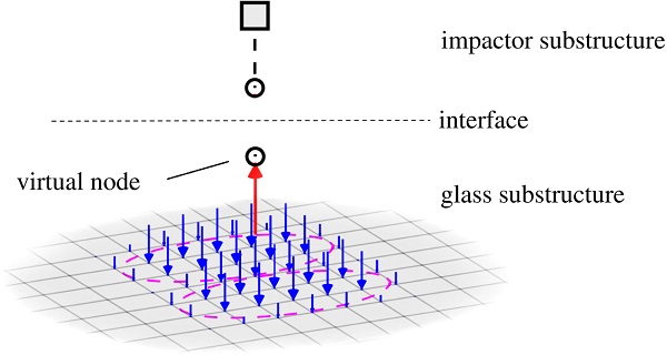 The subdivision of the coupled glass–impactor system into substructures is illustrated in Fig. 3. Interface reduction is applied, as further discussed in Section 2.3, such that only one virtual boundary DOF is retained for the glass substructure, corresponding to a weighted mean vertical displacement of a group of nodes considered to be in contact with the impactor tires (see Fig. 3). The reduced substructures are assembled in a standard manner to form a reduced model of the coupled system. Strategies for computing the dynamic response of the assembled system is further discussed in Section 2.4.