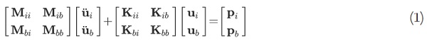 where ui, stat = −Kii⁻¹Kibub is the quasi-static solution, obtained from Eq. (2) assuming üi and üb are zero. The dynamic part, y, is added to the quasi-static solution to provide the dynamic response. Further, by inserting Eq. (3) into Eq. (2) and rearranging the terms, the dynamic response of y can be expressed as