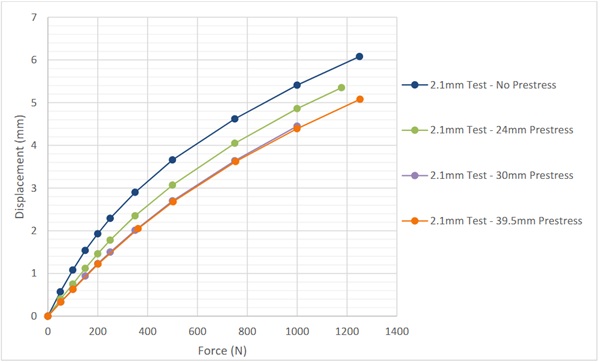 A comparison of the test result data for 1.1mm prestressed and 2.1mm control specimen yield some remarkable results. The prestressed 1.1mm specimen can meet or exceed the stiffness of a conventional 2.1mm specimen, also shown in Figure 19. In other words, the same deflection performance can be achieved with just over half of the raw materials.