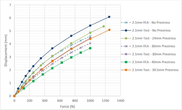 For discussion purposes, it appears from Figures 12, 15, and 18 that the finite element modelling overestimates the stiffness of the 2.1mm specimens and underestimates the stiffness of the 0.5mm specimens but closely tracks with the 1.1mm specimens. Perhaps this is related to the effects of the boundary condition not responding the same for various thicknesses, or perhaps this is even related to the stiffness of the EPDM, as the EPDM deformation would be included in the measurements taken. Regardless, it is clear on both finite element models and specimen testing that increasing prestress derived from flattening a warped shape results in increased stiffness.