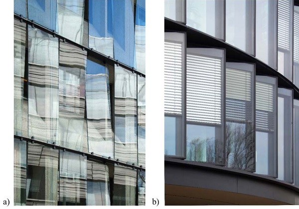 A serrated envelope usually serves as the thermal façade of the building but can also function as the external layer of a double-leaf envelope, in which case it has single glazing – e.g. KfW banking group office tower in Frankfurt am Main, (arch. Sauerbruch Hutton, 2010) or the ESO European Southern Observatory (arch. Auer Weber, 2008) – see Fig 2b. In the majority of cases the serrated façade is fixed to the loadbearing structure of the building at the slab level.