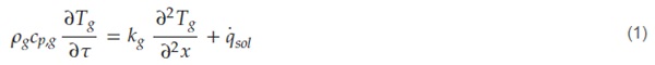 where 𝑇𝑔 is the temperature (K) of the glass; 𝜌𝑔, 𝑐𝑝,𝑔, and 𝑘𝑔 represent, respectively, the density (kg/m3), specific heat (J/(kg∙K)) and thermal conductivity (W/(m∙K)) of the layer; 𝑞˙𝑠𝑜𝑙 is the solar heat source (W/m2), and τ is the time (s).