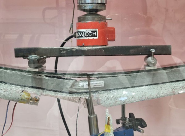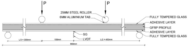 For the monotonic loading test configuration, the beams were supported on a metal frame as shown in Figure 3, and the load was applied using a manually controlled hydraulic jack at a stroke rate of 1mm/min. The applied load was measured using a duly calibrated 50 kN load cell manufactured by NovaTech, while a 50 mm LVDT transducer placed at the bottom glass face sheet of the beam measured the midspan deflection. The hydraulic jack was connected to a metal distribution frame with two steel rollers at a span of 300 mm, whereas the specimen was rested on two steel rollers at a clear span of 900 mm. To prevent localized stresses and to prevent premature failure on the glass face sheets, all four contact points between the glass and the steel support rollers were fitted with 6mm aluminum tabs spanning the full width of the specimen.