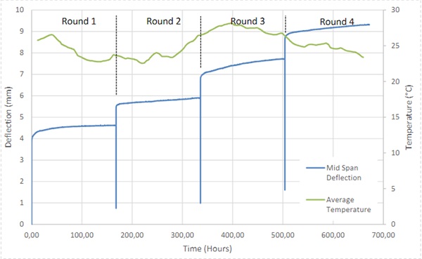 In this section the results of the long-term loading condition are explained, and the results are compared against the monotonic loading condition to observe any differences in the beams performance. As mentioned in section 3, Mid span deflection and the ambient temperature fluctuations were measured along with the mid span strain data however it should be noted that the strain data is not published in this paper. Each loading stage was analyzed individually where the mid span deflection at the end of 168 hours is shown below in Table 4 along with the mean deflection for each round.