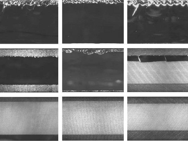 The comparison of the edge surfaces of the individual test series shows no significant differences. On closer inspection, the grinding pattern with slight parallel grooves can be seen. However, the microscopically visible grinding pattern is hardly visible on a macroscopic level. Therefore, the edge surface is clearly classified as polished.