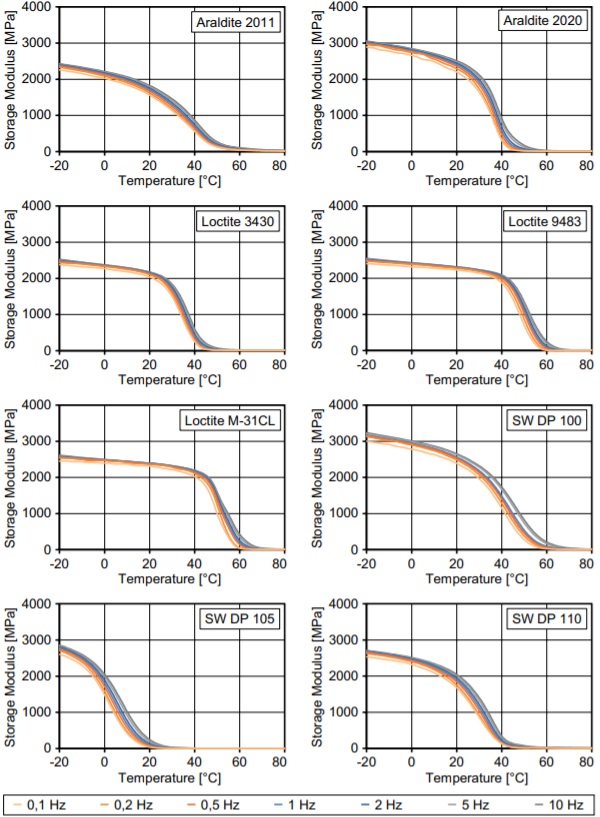 The material behaviour of the adhesives investigated is temperature-dependent. At the beginning, the storage modulus shows a continuous reduction with a slightly decreasing curve. The thermomechanical behaviour is only marginally frequency-dependent. The significant modulus step, which characterizes the glass transition, is clearly pronounced for all adhesives.