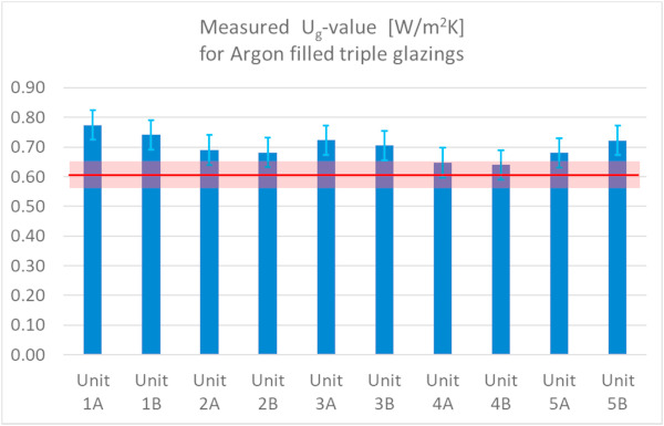 The results of the guarded hot plate measurements on two single glazing units for each of the 5 different brands are summarized in Fig. 6. The red line indicates the common value declared by all producers for their respective product. The transparent bar shows the limits of values which can be rounded down to one digit and result in 0.6 W/m2K for the Ug-value. Accordingly, it is only the units of brand 4 which narrowly comply with the declared Ug-value. The two units of brand 2 are slightly higher but the other 3 brands are clearly at 0.7 (±0.05) W/m2K as can be recognized by the error bars indicated in Fig. 6. These results are comparable to those mentioned for triple glazing with argon filling and two coated surfaces in Refs. [6,25].