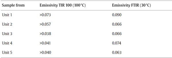For additional control, the calibration of this method has been double-checked by measurements with an emissiometer TIR 100 (INGLAS). The emissiometer TIR 100 allows to measure the MIR reflection of the heat radiation originated from a black hemisphere kept at 100 °C. The reflected infrared radiation is observed at an angle and is converted into a numeric value. This value is then plotted against a calibration table from high and low emissivity reference standards. In general, the thermal emissivity is a function of the temperature of the emitting surface. In practice, it is often assumed that the thermal emissivity of many materials undergoes only minor changes between temperatures of 27 °C and 100 °C. This method and equipment comply with EN 16012 [22] which has been established for reflective insulation products and does not comply with EN 12898 [14] mentioned earlier.