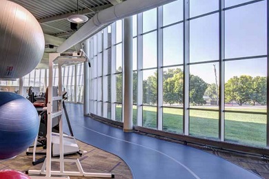 Situated on the south-facing aspect of the facility, the new Wellness Center features a 6.7 m (22 ft) high 279 sqm (3,000 sqft) curved glass curtain wall. Its south-facing position had the potential to present significant issues relating to heat gain and glare had the architects not employed SageGlass®, an electrochromic glass deployed specifically to control solar gain and glare while maximising the daylight entering the open spaces within the Center.