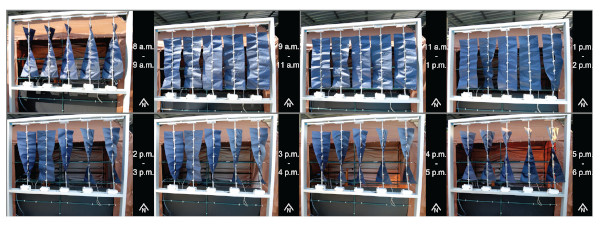 Figure 18 illustrates the kinetic façade (version 2: twisting movement) at a record of movement at different times of the day between 8.00 a.m. and 6.00 p.m., with a time-lapse technique for observing the kinetic façade behavior. The result is that the kinetic façade was able to respond to the sunlight at different angles related to sunlight intensity on the testing day.