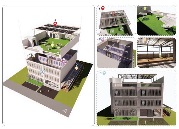 Figure 21 shows the guidelines for applying the various solutions. This study was illustrated in terms of five solutions, as follows: (A) the rooftop kinetic shading, (B) the kinetic parasol, (C) the kinetic partition, (D) the interior kinetic curtain shading, and (E) the kinetic façade (prominent for development in this study).