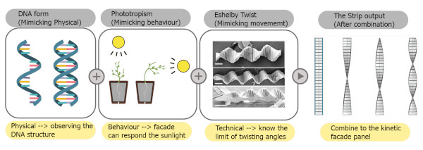 Secondly, the translating process integrates the biological ideas selected from the identity process, such as DNA, phototropism, and Eshelby twist. These natures must be translated into the main features, namely, physical aspects, behavior, and movement of nature. First, DNA is selected for the physical set, since DNA has a complex structure that can twist the form by stimulus [48]. Second, phototropism is selected for the behavior set, since this feature is crucial for plants that respond to sunlight; thus, this feature can also apply to the kinetic façade feature. Third, Eshelby twist movement is the natural movement phenomenon from nanowires. The twisted form is similar to a pine tree with a hierarchical twist; the stimulus affects each twist movement [49]. These three natural identities must be integrated to transfer the uniqueness to the kinetic façade innovation. Thirdly, the discovery process is finding the strategies of nature.