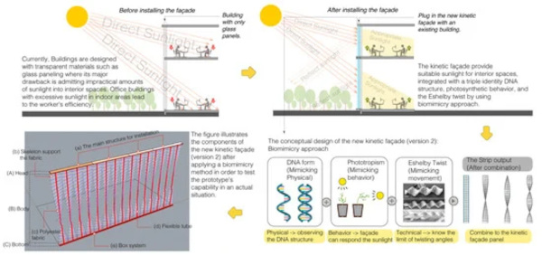 This study had three components to accomplishing the kinetic façade target: physical environment, behavior, and movement. First, the idea of physical aspects stems from the physical DNA structure that will be the main structure of this innovation; since the DNA form is flexible, it can respond to the aim of this study, which is that the façade is flexible to respond to sunlight. Second, behavior is viewed in light of the phototropism phenomenon of plants that want to receive sunlight; this phenomenon is a beneficial feature for the kinetic façade and can adjust itself according to the sunlight intensity. Third, the Eshelby twist is the phenomenon of a nanowire pipe tree with a twist; it is a fascinating movement with a hierarchical twist. This twist is caused by interference from external stimuli, resulting in a progressively higher degree of twist. This movement can be integrated into the DNA structure to develop into the engineering part. Fourthly, the abstract process reverses the ideas from the previous three steps and applies them to the engineering section, making them applicable to responding to sunlight and installing buildings.