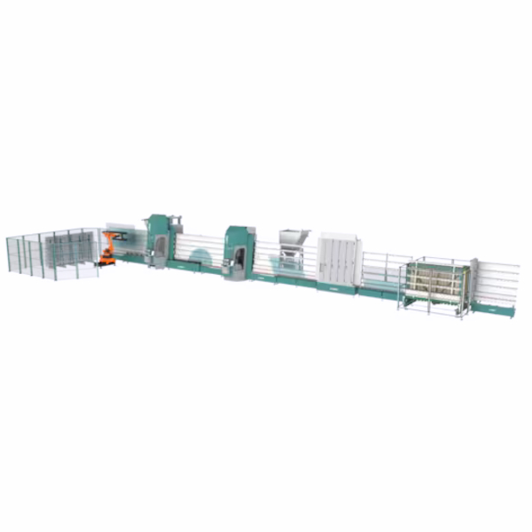 Vertical LiTROS Insulating glass line for manufacturing insulated glass elements with rigid spacer frames.