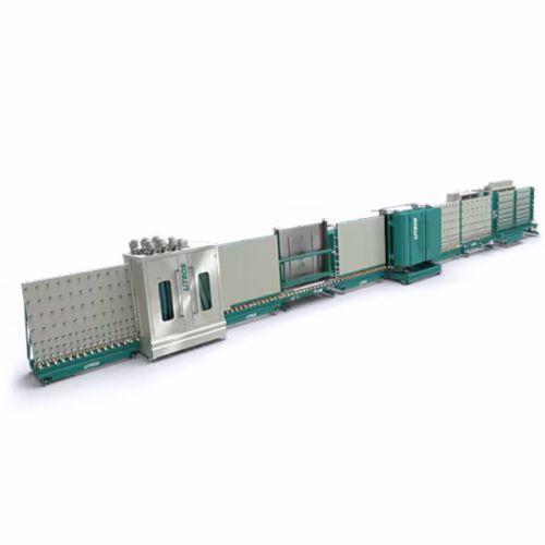 Vertical LiTROS insulating glass line for manufacturing insulated glass units with rigid spacer frames.