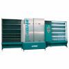 Sorting and storage buffer for vertical lines with 30 storage compartments for flat glass and fully automatic, unmanned loading to avoid downtime.