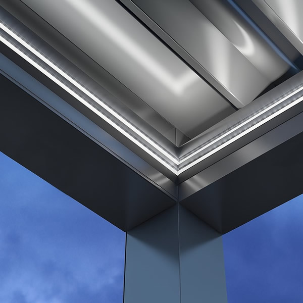 Relaxing moments even during the night, thanks to the integration of LED strip lights, which can be installed either on the louvres or on the transoms. For "atmospheric" lighting, it is possible to install perimetrically concealed LED strip lights. In addition, it is possible to select the desired light intensity through a dimmer, because every occasion requires specific lighting! The LED lights are turned on through the same remote control that is used to adjust the louvres and the rolling ZIP-screens.