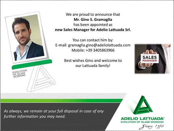 Adelio Lattuada Srl announces that Mr. Gino S. Gramaglia has been appointed as new Sales Manager.