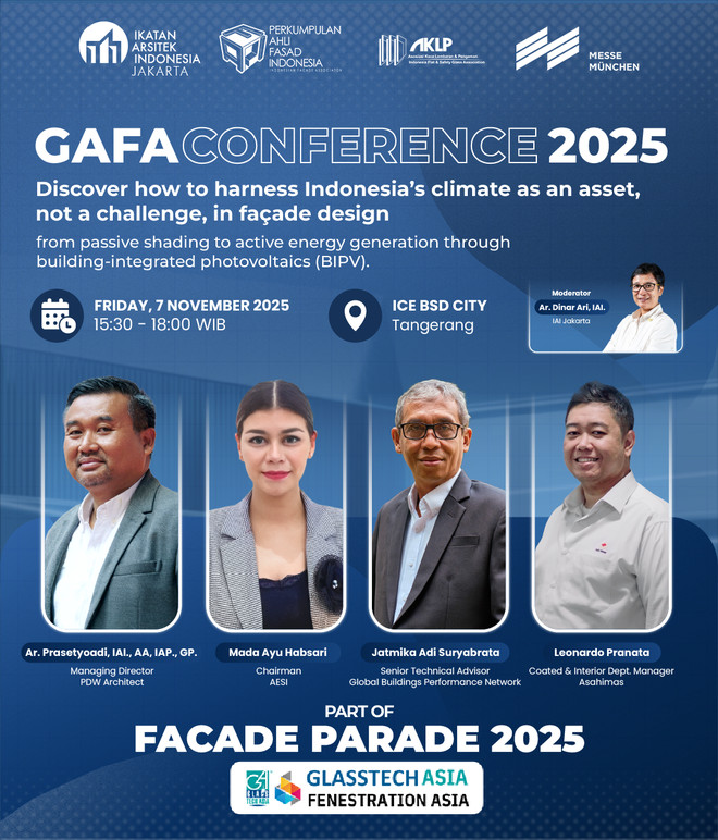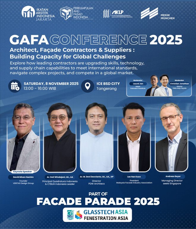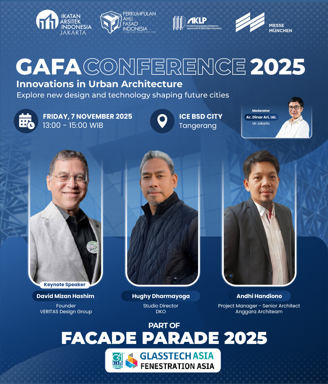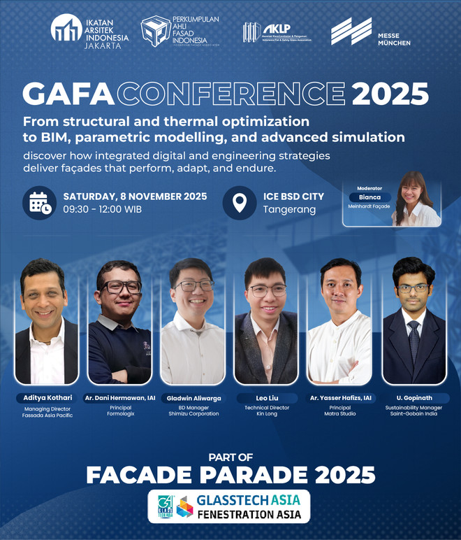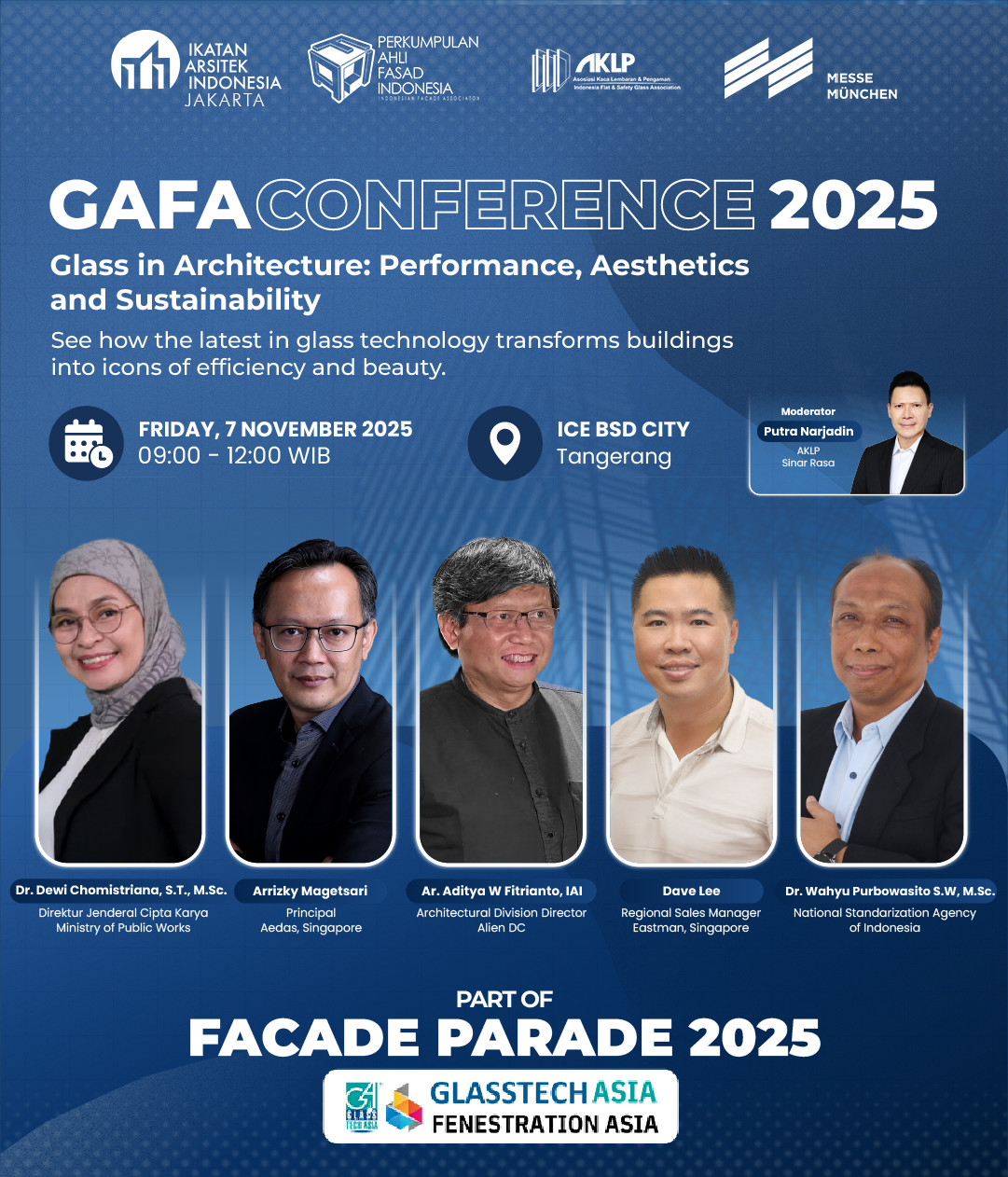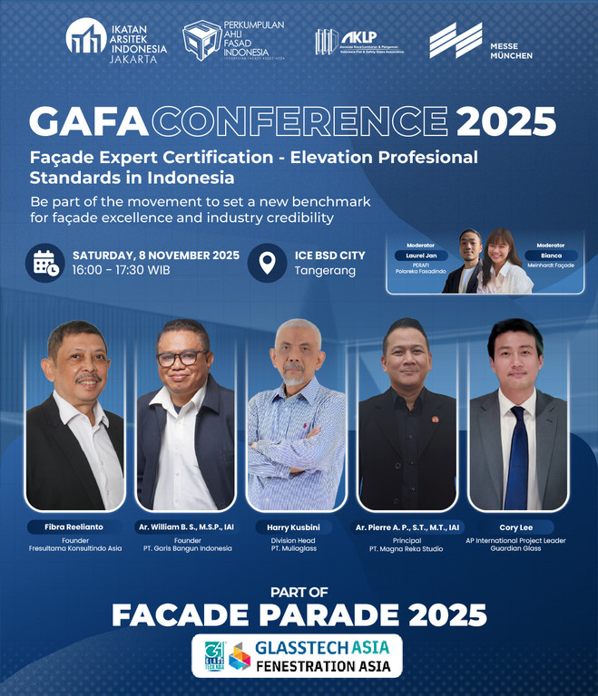 Held within the Asia Facade and Glass Conference 2025, the Façade Parade gathers leading architects, façade specialists, and industry innovators to explore how design, technology, and sustainability are shaping the future of building façades. Expect two inspiring days of expert presentations, live demonstrations, and networking opportunities with Indonesia’s façade and glass community.